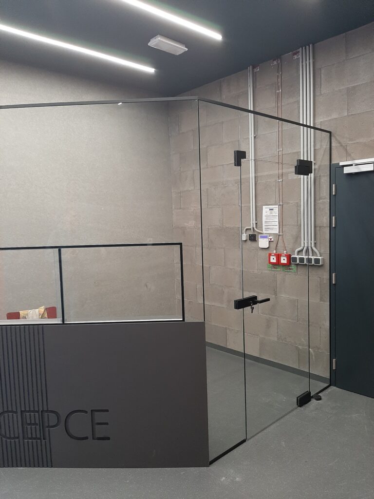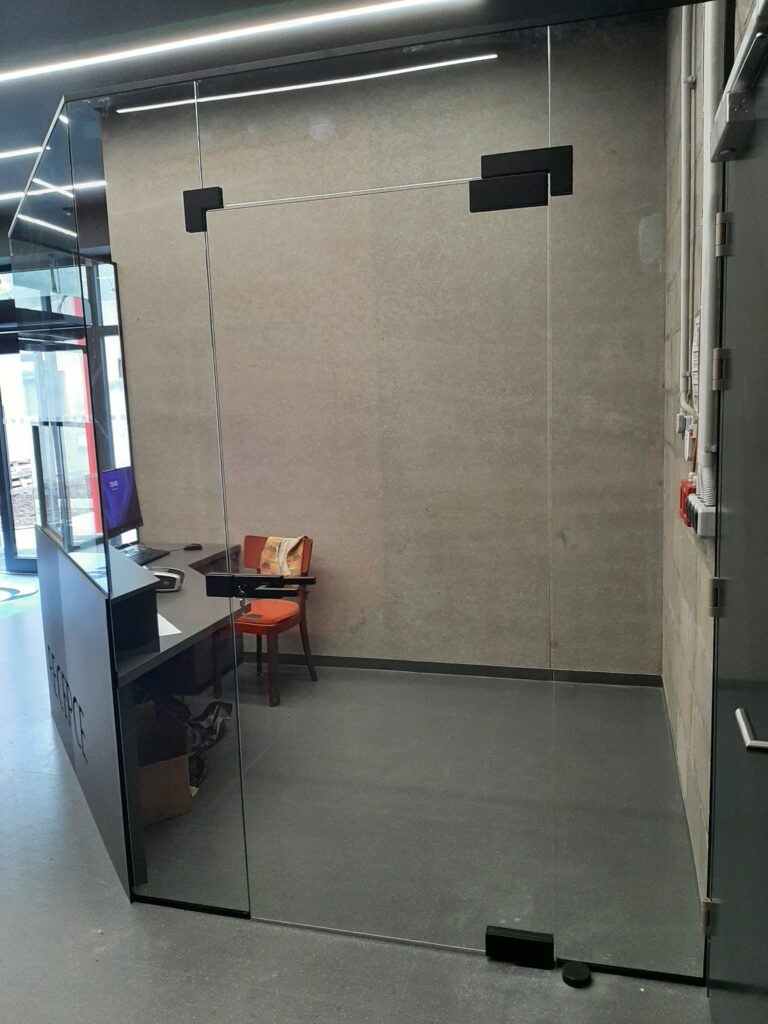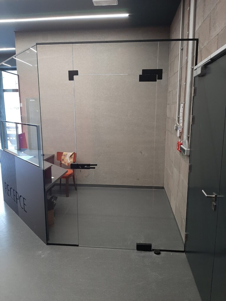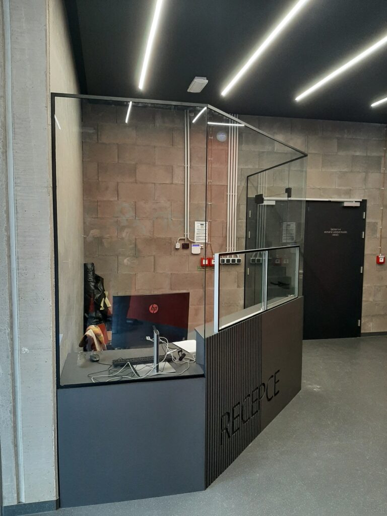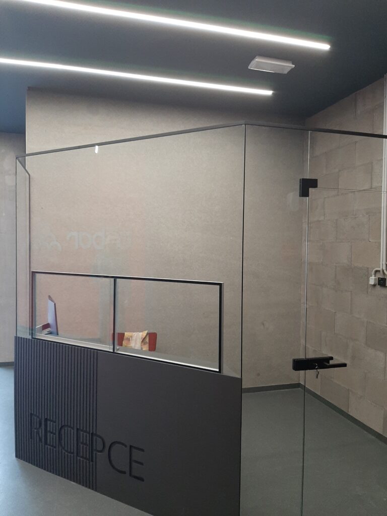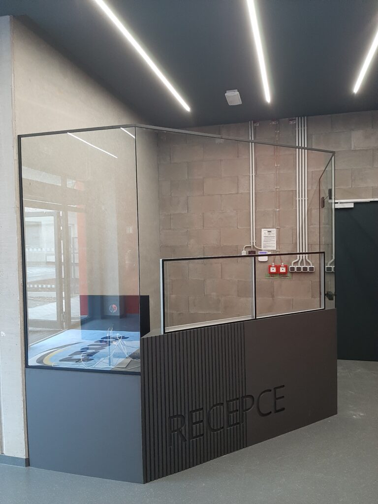 Zasklení recepce – bezpečnostní sklo (uzamykatelné podávací posuvné okénko a dveře)